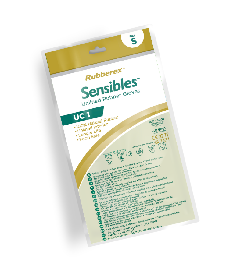 Guants setinats de làtex de Rubberex sense apelfat interior i d’un color natural clarament visible per donar-nos compte de qualsevol possible tall en el guant.