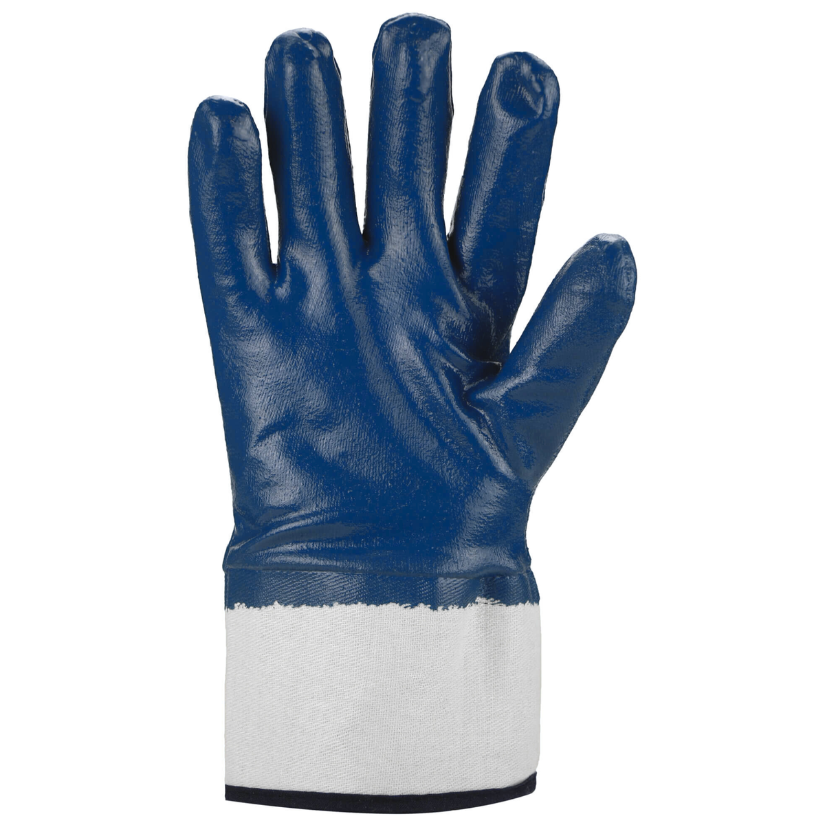 Guants de nitril pesat amb tota la mà recoberta de nitril blau NBR, sobre tèxtil de jersei i maniguet de lona de seguretat.