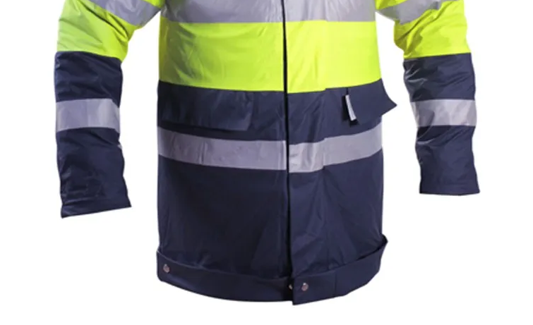 Parka desmuntable bicolor groga/blava feta de polièster Oxford/PU. En disposar d'un folre interior desmuntable encoixinat també de polièster (forrat polar), ens ofereix una versatilitat molt gran per a un ús encara més extens. Disposa de cremallera central de niló protegida per una tapeta de veta adherent, dues butxaques exteriors i una interior. La caputxa es troba amagada en el coll.